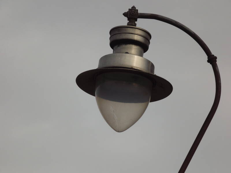 The clip on this lantern has failed completely (sometime during 2021) causing the lantern to half-open, only the column is preventing this from hanging on the hinge entirely. This does make me wonder about the serviceability of this installation, the lantern would have to be twisted on it's bracket to open it properly. Also notice the column number is on the lantern's body as-well-as the column. It appears as if these columns were re-numbered at one point.
