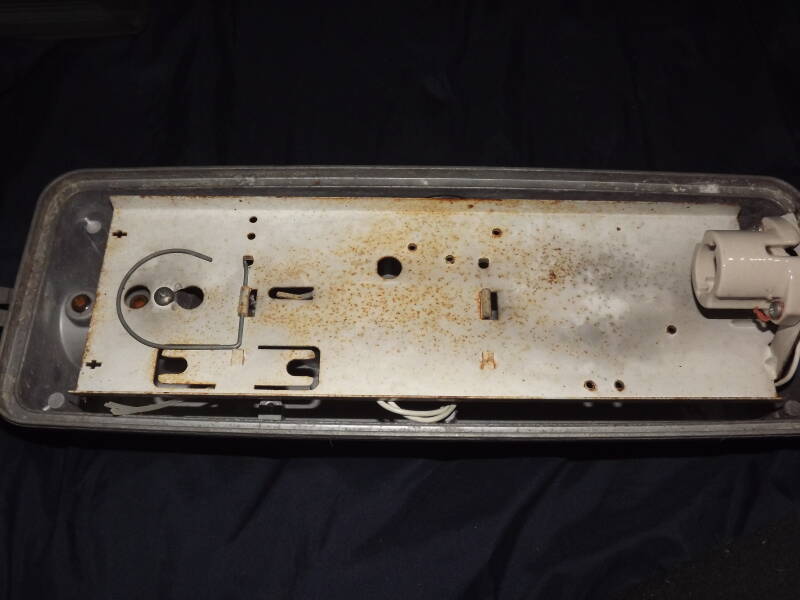 The bowl is knackered, having been shot at repeatedly, leaving holes all over, the hinge is also broken. Despite this, it somehow stayed up there and didn't fall off. Rust can be seen on the gear tray lamp holder mounter inside. Earwigs were infesting this lantern. It took me a while to remove them, but it was worth it!
