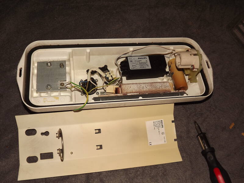 It has an SX72 Philips ignitor, and (from what I can make out) a Philips BSX 355L (82?) ballast. It is very hard to read however it's the same ballast -and ignitor- that are in my other Philips MI26.