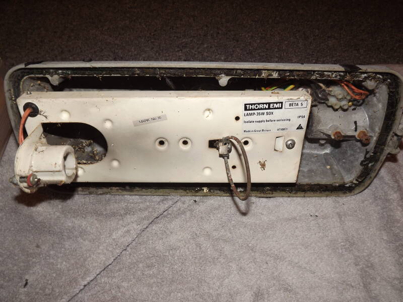 This is the first Thorn Beta 5 in the collection, coming from AgentHalogen_87's personal collection. It's a Mk.16 remote geared lantern, running 35W SOX. Being the Mk.16, it dates back to between 1984 and 1987. This photograph showcases the lantern in as-received condition. The bowl isn't the lanterns original bowl, evident by the black tape still extant on the lantern's canopy. The tape would have previously kept the original bowl up there!