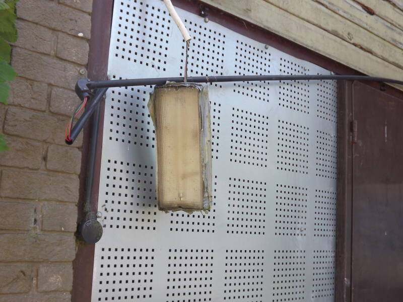 An abandoned community centre in Leyfields, Tamworth, sports several emergency fixtures and RAB WPTS70 bulkheads. They are not in great condition; this emergency fixture is hanging on by the wires!