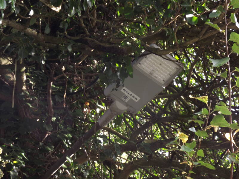 Hidden down this quiet lane are a few installations which may not be noticeable at first glance. They have both recently had Holophane S-Line lanterns installed on them, but they still remain hidden. The first one is this wooden column which is now living again thanks to being consumed entirely by a tree. The metal arm of the bracket and lantern both protrude from the tree trunk.