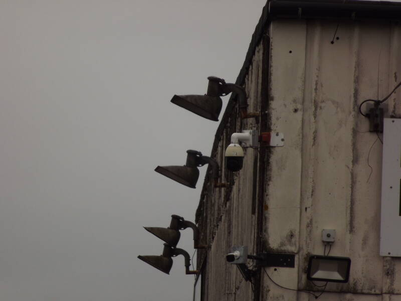 Alongside some Thorn Grenvilles, on the front of the main Nemesis Rail depot building are several Benjamin Duoflux shovel floods fitted with what appear to be mercury lamps. With the presence of several LED floods, I doubt the Duofluxes or Grenvilles are in active use.