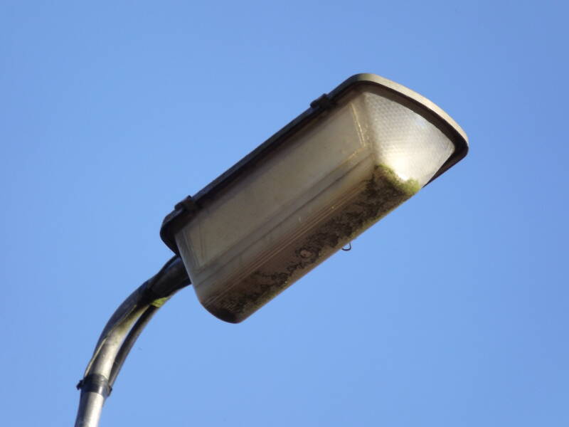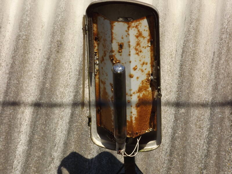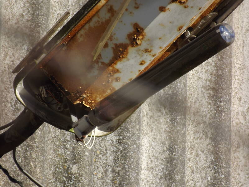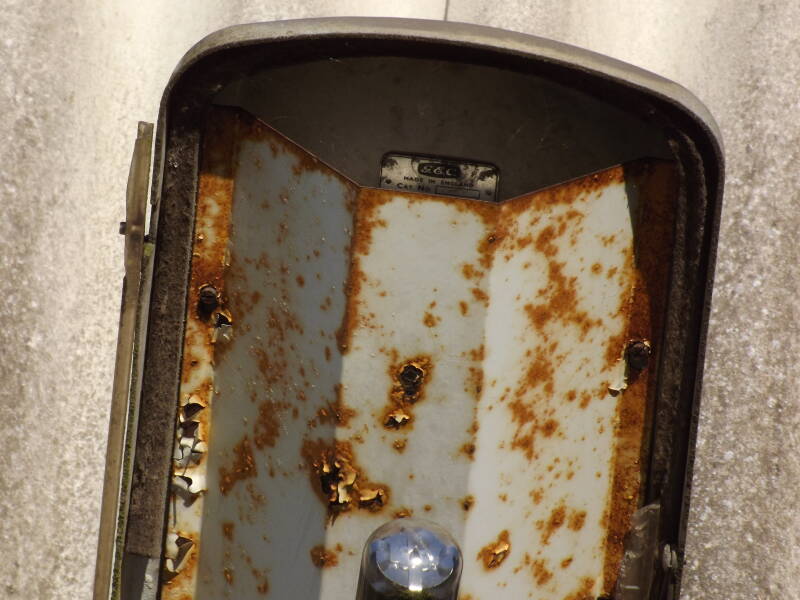 The GEC name plaque is visible beneath the reflector-tray at the front of the lantern. Aiding in this visibility is the fact that the bowl is missing. Only a small amount of polycarbonate exists where the hinges still are.