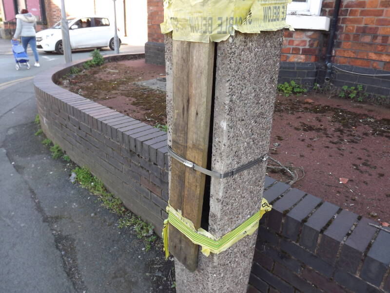 This installation exists on Victoria Street, Crewe. A long-defunct GEC concrete column (with a height of 8m) is installed on the side of the road. It likely supported a GEC Z8430CM lantern originally. It has remained in this condition for two decades at least.
