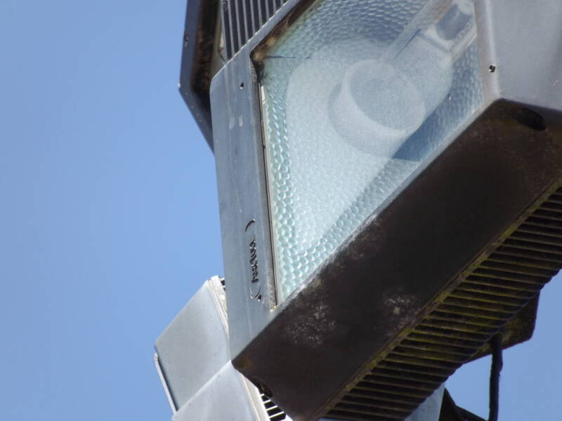 Arcluce's logo is cast into the door. From this close-up we can also see the metal halide lamp is certainly dead, just look at that arc-tube!
