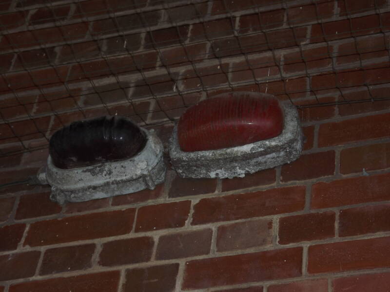 Lichfield City Train Station features two rarities, bundled together upon the same wall - on the right, a BH.10 with red glass, and on the left, an SP.6 with red glass.