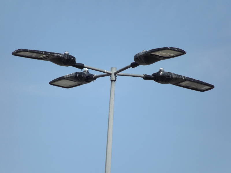 Along the A601 are a few columns featuring quadruple-brackets. On each arm is a Kirium Pro 3 lantern, these had been installed for less than one year in 2025 when these photos were taken.