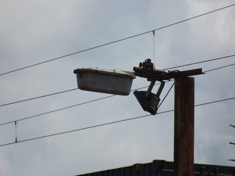 The HW745's bracket seems to be made from a conglomerate of pipe-work. One small hole is present in the front of the bowl, but other than that the lantern looks intact. A more-modern halogen flood is attached to the "bracket" - an indication the HW745 is no-longer in use.