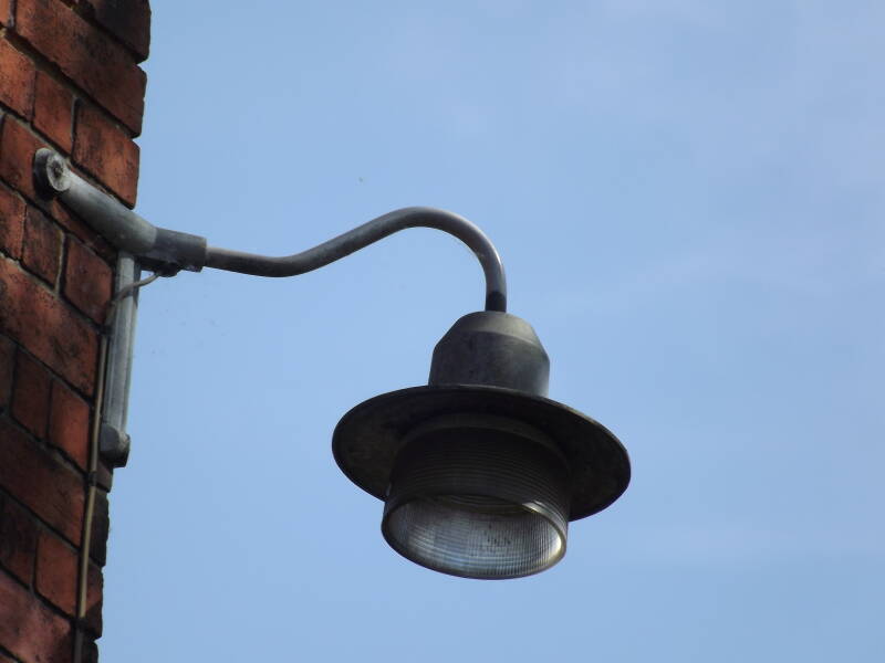 This example is located off Queen Street, where it is mounted on the side of a closed-down factory. The lantern is situated on a corner-wall-bracket that would ordinarily be used for Coughtrie lanterns (or something similar).