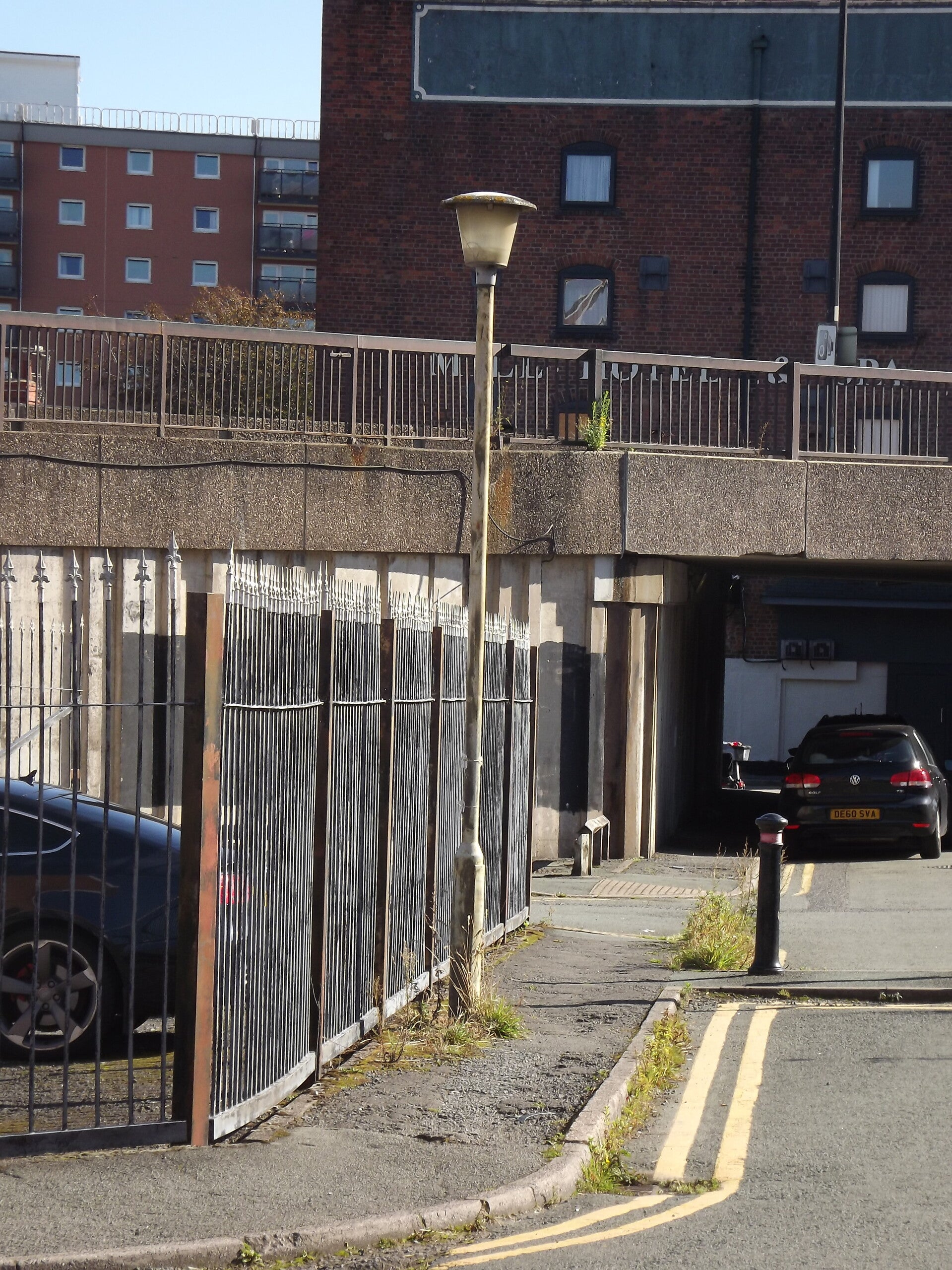 With thanks to the security guard for allowing me to photograph the following installations, as well as information on some of the fittings. Situated around Castle Square are a multitude of old lanterns, such as GEC Z5640s, CU Phosco P111s, a P108A, and some DW Windsor Yorks. Among these other fittings are also some GEC Z5670s for GLS lamps. The first example is fitted to a wall-bracket, and would have replaced a damaged Z5640. This one has a longer spigot, meaning it is older than the previous example. Notice the supply cable enters the lantern at the base (rather than through the spigot) and the bracket is fixed to the exterior of the spigot. A small metal plate is used to cover the spigot opening, and what may be a cable for an external photocell can be seen. I think this lantern now runs a domestic LED golf ball lamp.