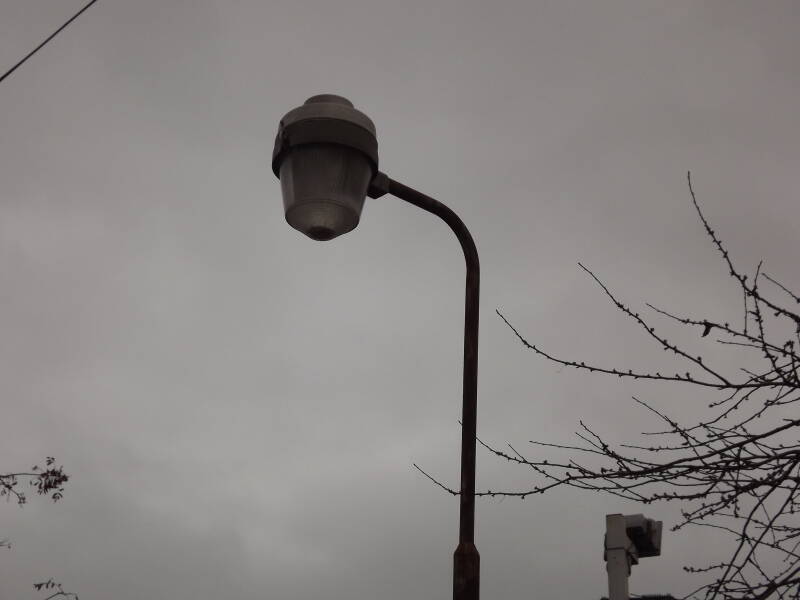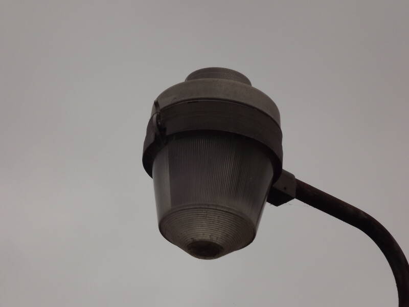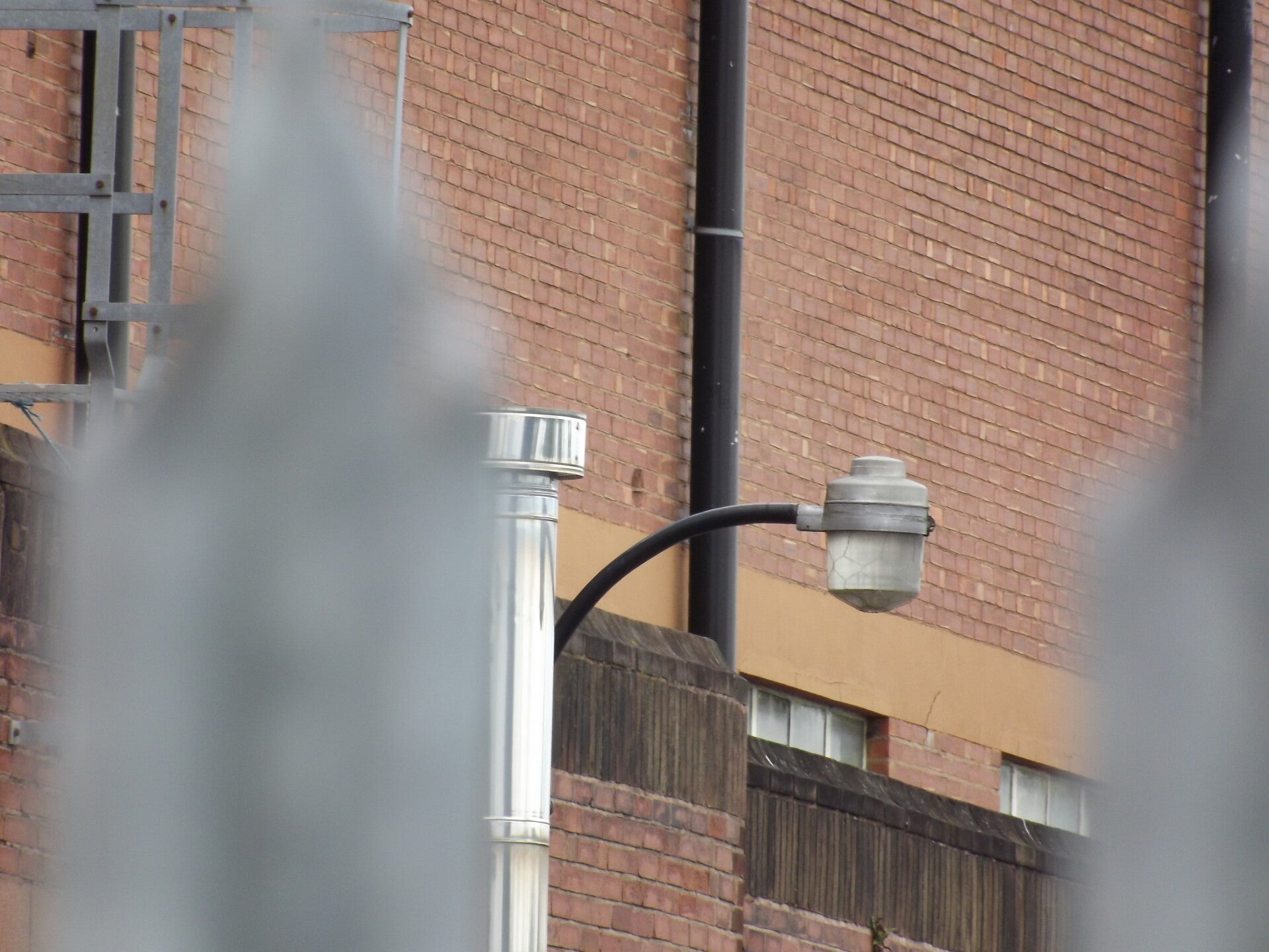 This GEC Difractor was spotted attached to a wall-bracket on an industrial site off Fort Parkway. This one still has a wire cage around the bowl.