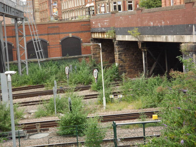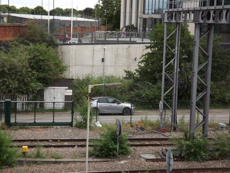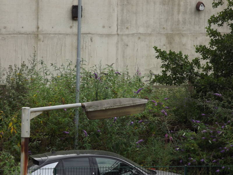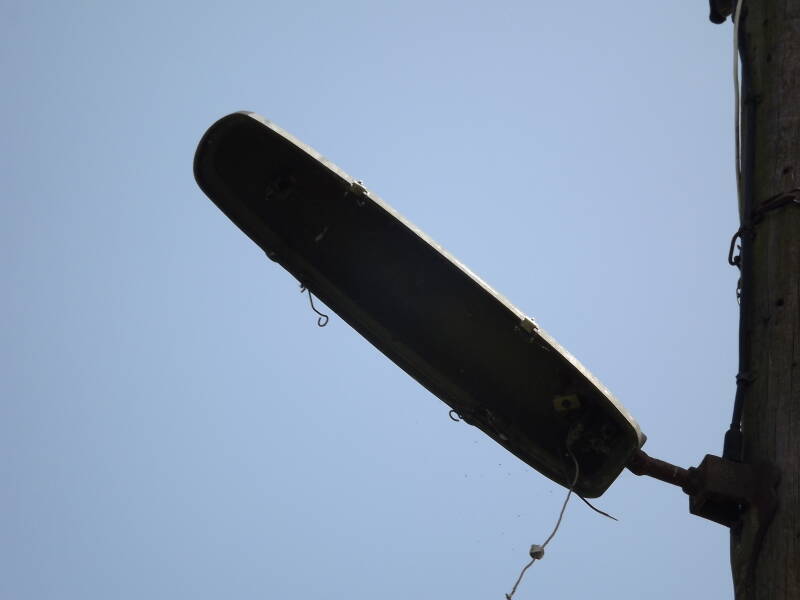 Redundant columns line the remains of an old access road to a railway depot (DB Cargo UK, Toton TMD). They vary massively in age, with some base-hinged abacus columns (very few of which still have lanterns) and two wooden powerlines with GEC Z8260 lanterns attached via brackets. The old access road can be seen on the map here, having lead up to where the old loco shed was.