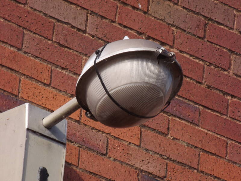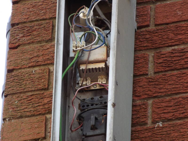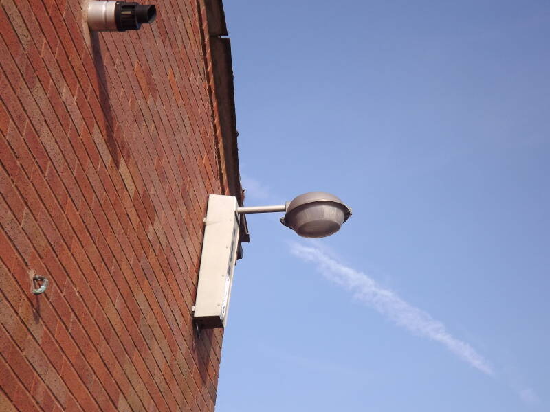 More GEC Z8896s exist in Amington, Tamworth. They run 80W MBF and are all wall-mounted, This one has it's gear box door missing, allowing us to see inside. It is located on Hornbeam and it even still works!