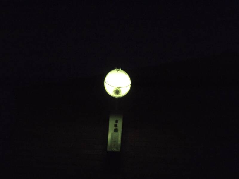 I returned on the warm spring night of 05/05/2024 to see them in action. Lantern T31 was pictured first. The zip-tie is clearly visible, owing to the damaged hinge. A plethora of dead bugs are laying in the bowl, having been lured in by the warmth of the lamp.