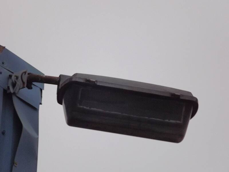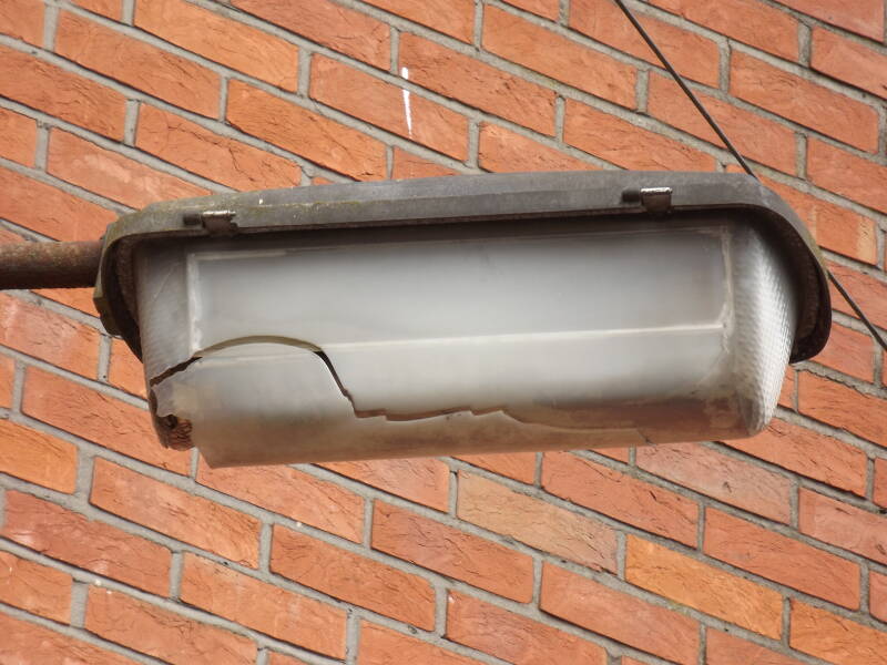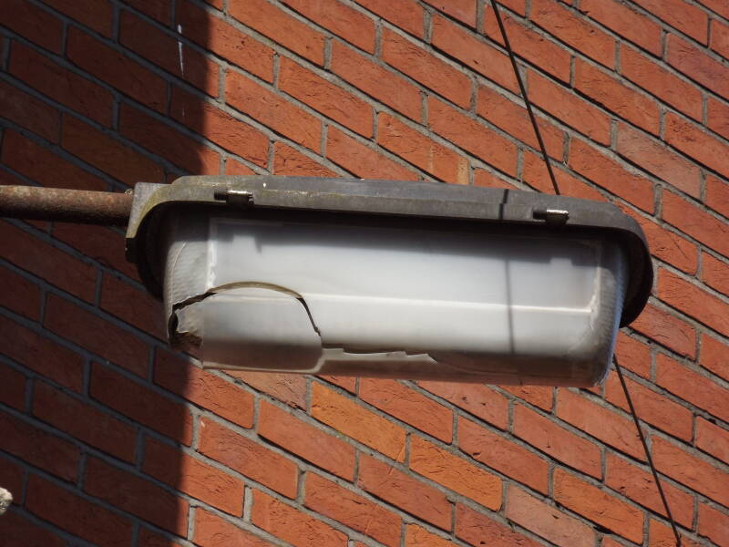 Out of the three, the final one is a complete unit, and is in the best condition. The bracket was angled about 45° to distribute the light around the corner of the building.