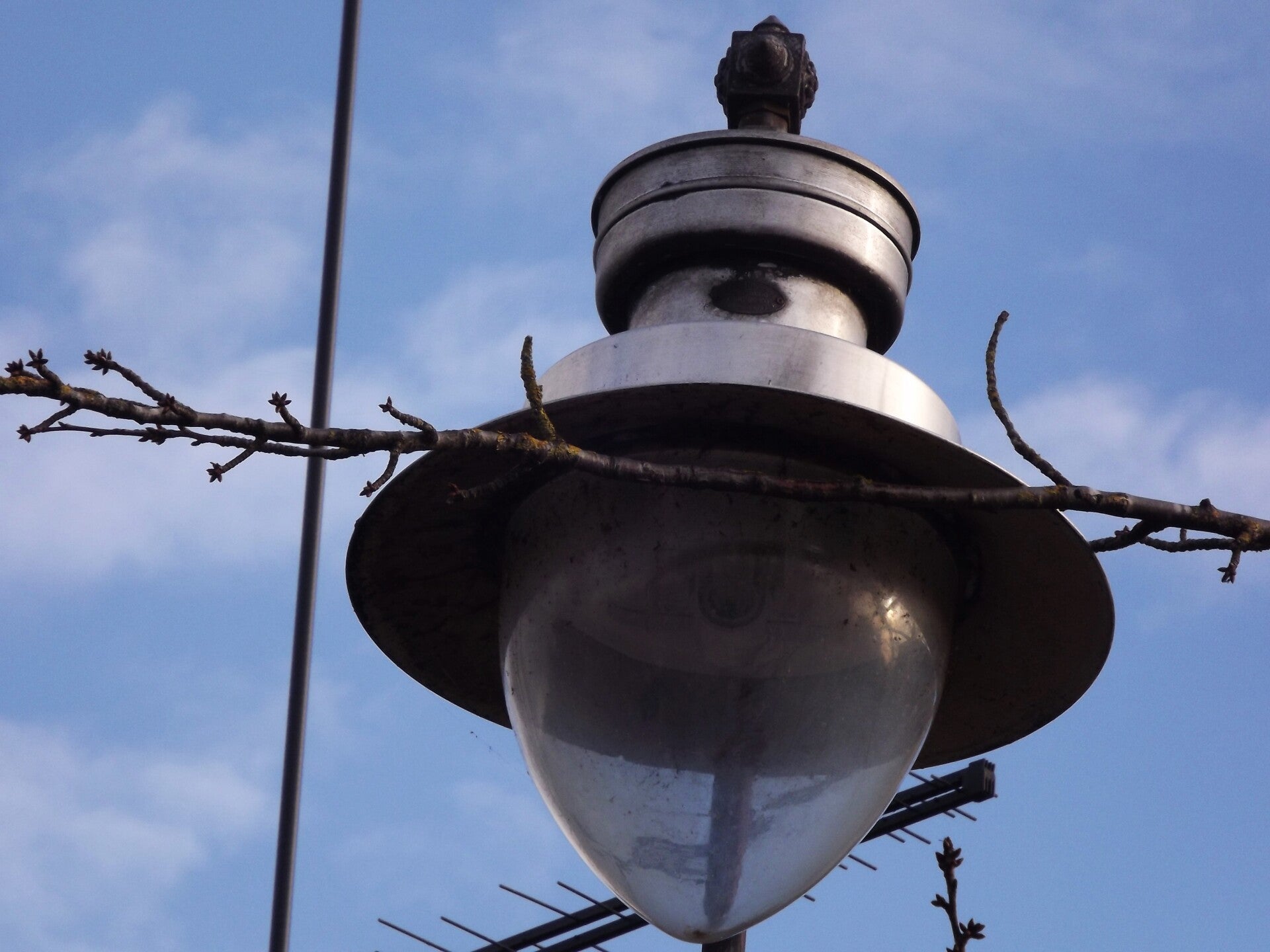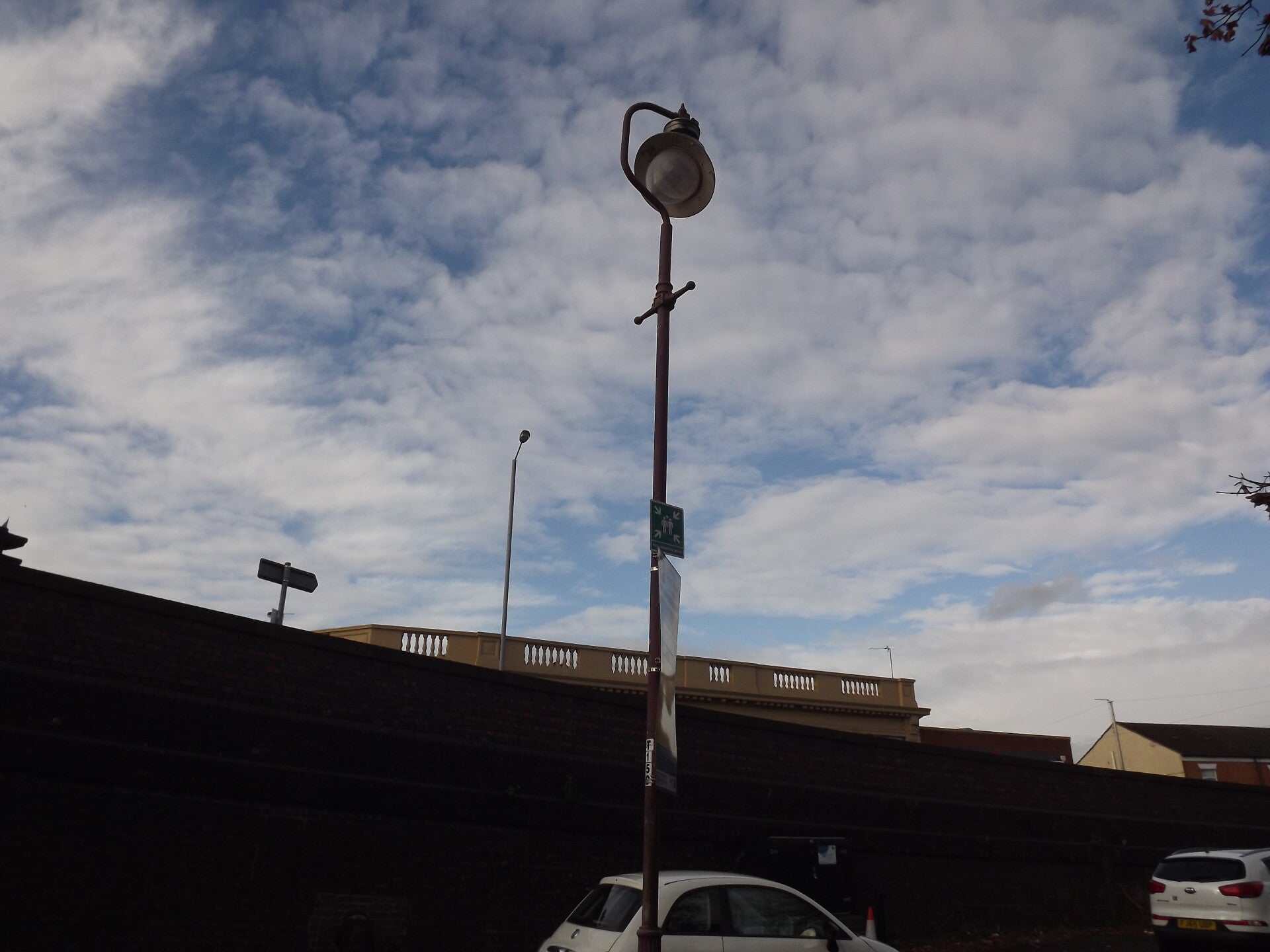 The clip on this lantern has failed completely (sometime during 2021) causing the lantern to half-open, only the column is preventing this from hanging on the hinge entirely. This does make me wonder about the serviceability of this installation, the lantern would have to be twisted on it's bracket to open it properly. Also notice the column number is on the lantern's body as-well-as the column. It appears as if these columns were re-numbered at one point.