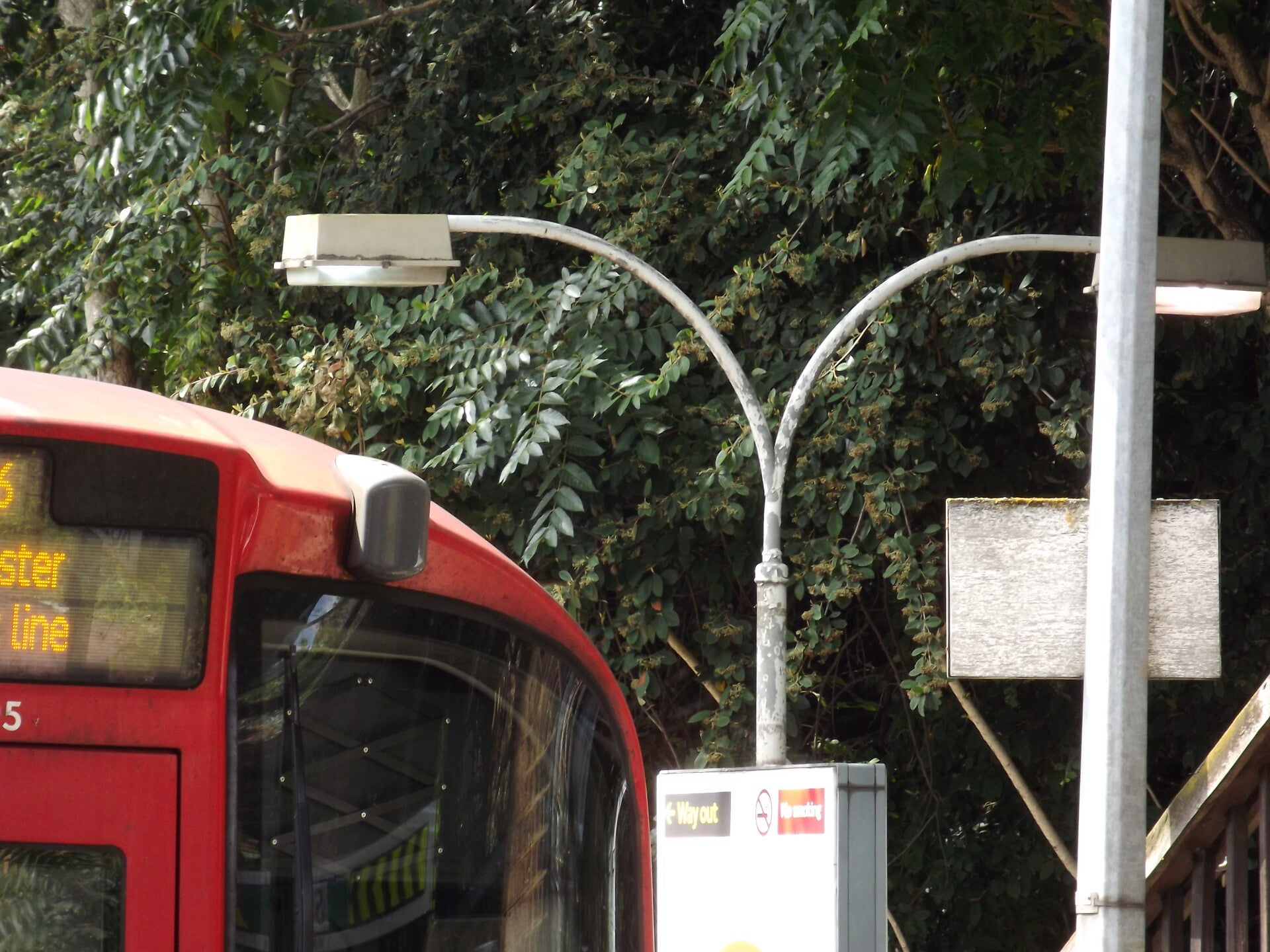 A twin-arm column is home to two P392s, but this isn't the usual twin-adaptor these lanterns could be supplied with.