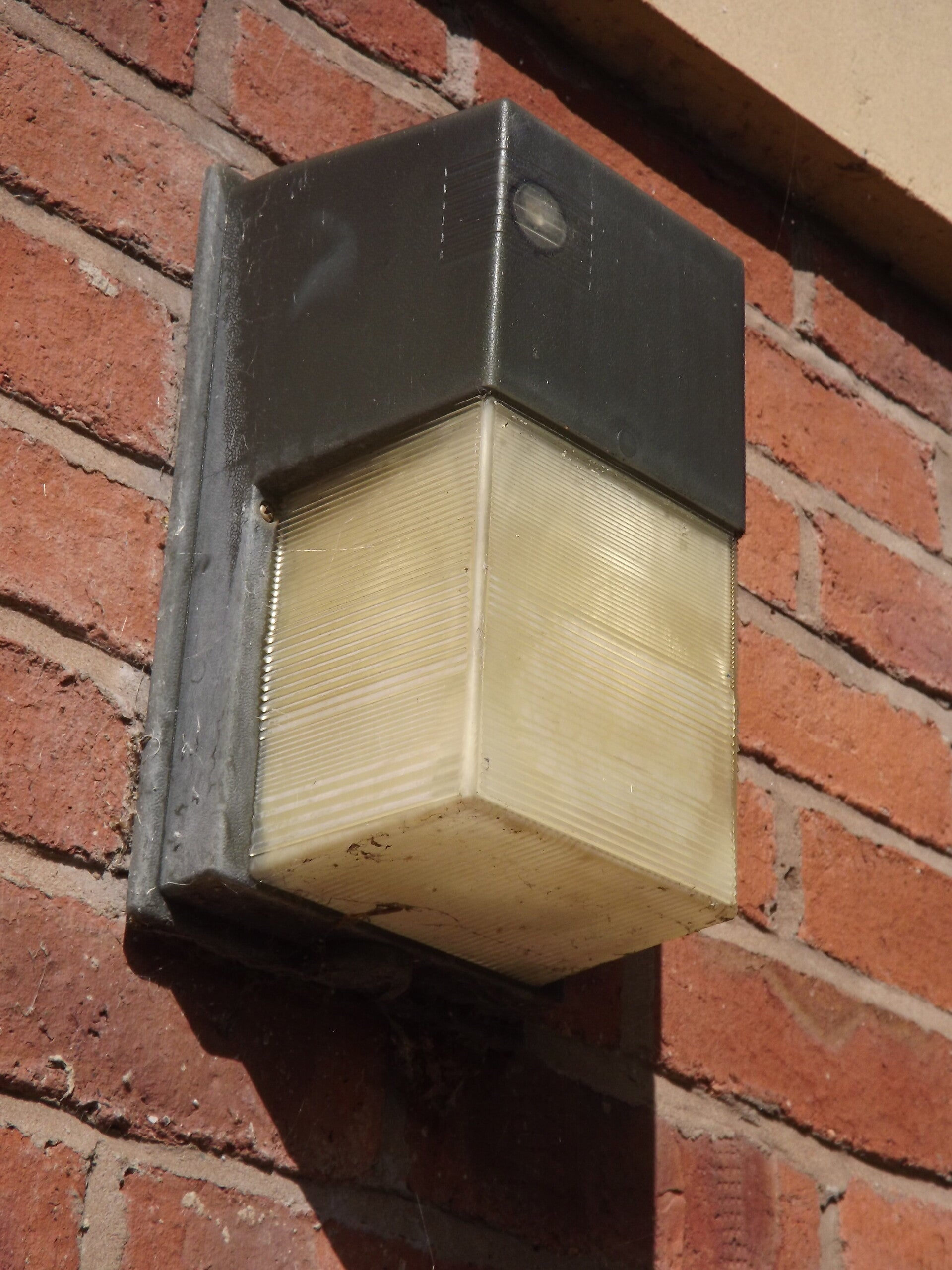 It looks to have been in service for quite a while! The heat from the lamp has stained and weakened the bowl, leading to cracks forming. The circle that's visible to the top left of the lantern is actually the built in photocell! This installation no longer works, and hasn't for several years.