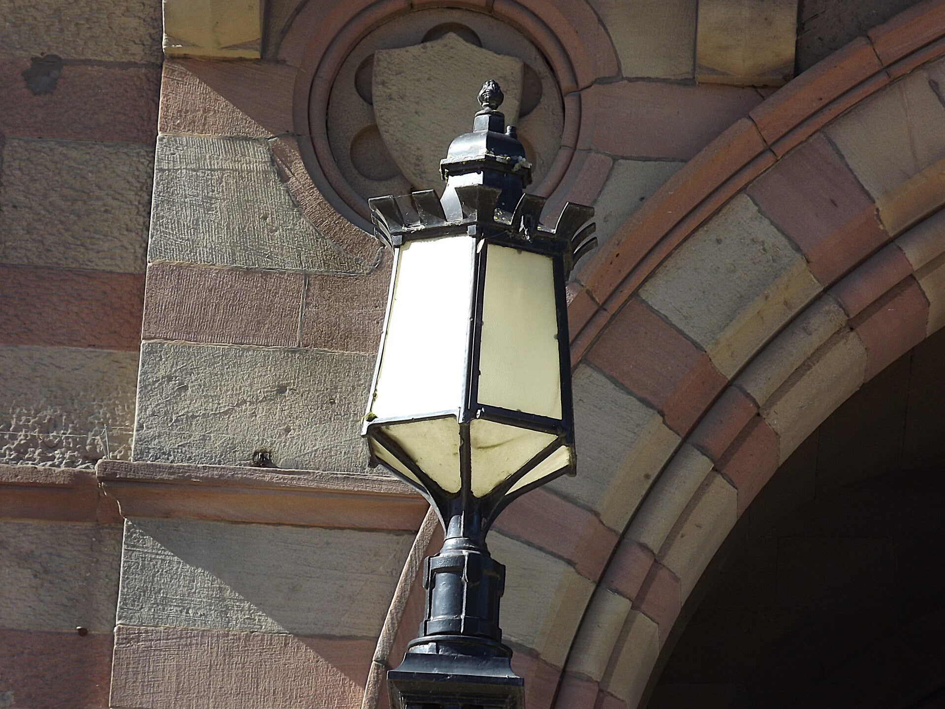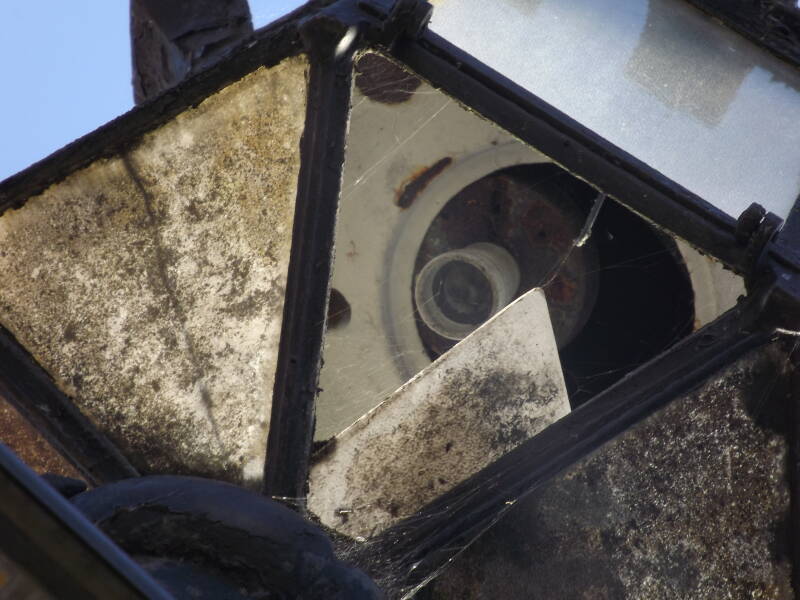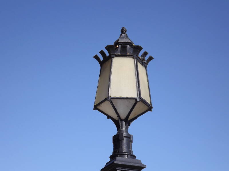 The lanterns appear to have replacement panels nowadays - the yellow tinge implies a polycarbonate composition.