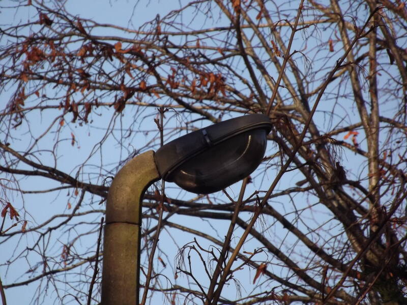 As it turns out, most (or maybe all) of the Birmingham Diadems are the Simplex variety. Inside is the 80W Venture MBF/U lamp. The NEMA socket looks like a newer-addition and not original to the lantern.