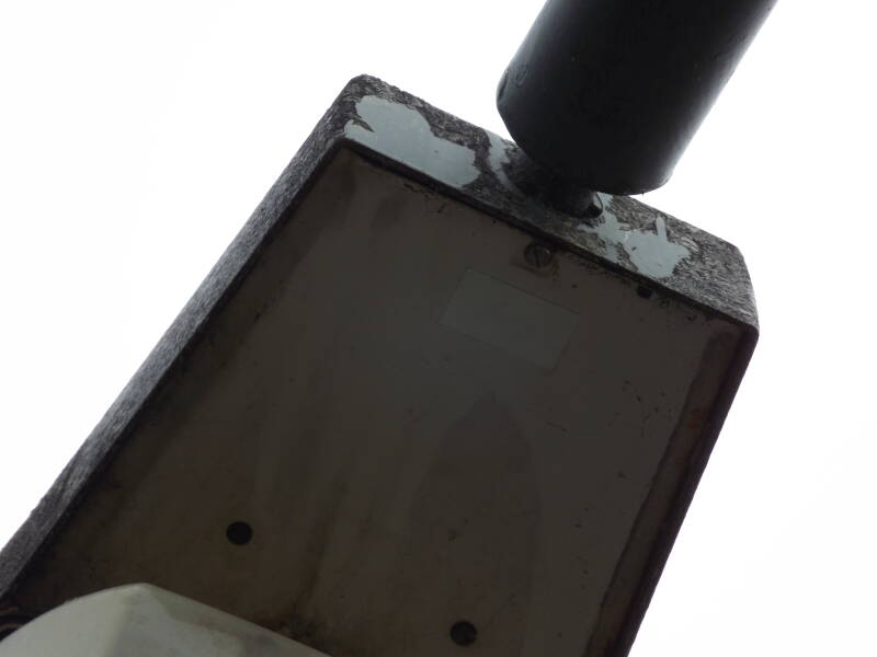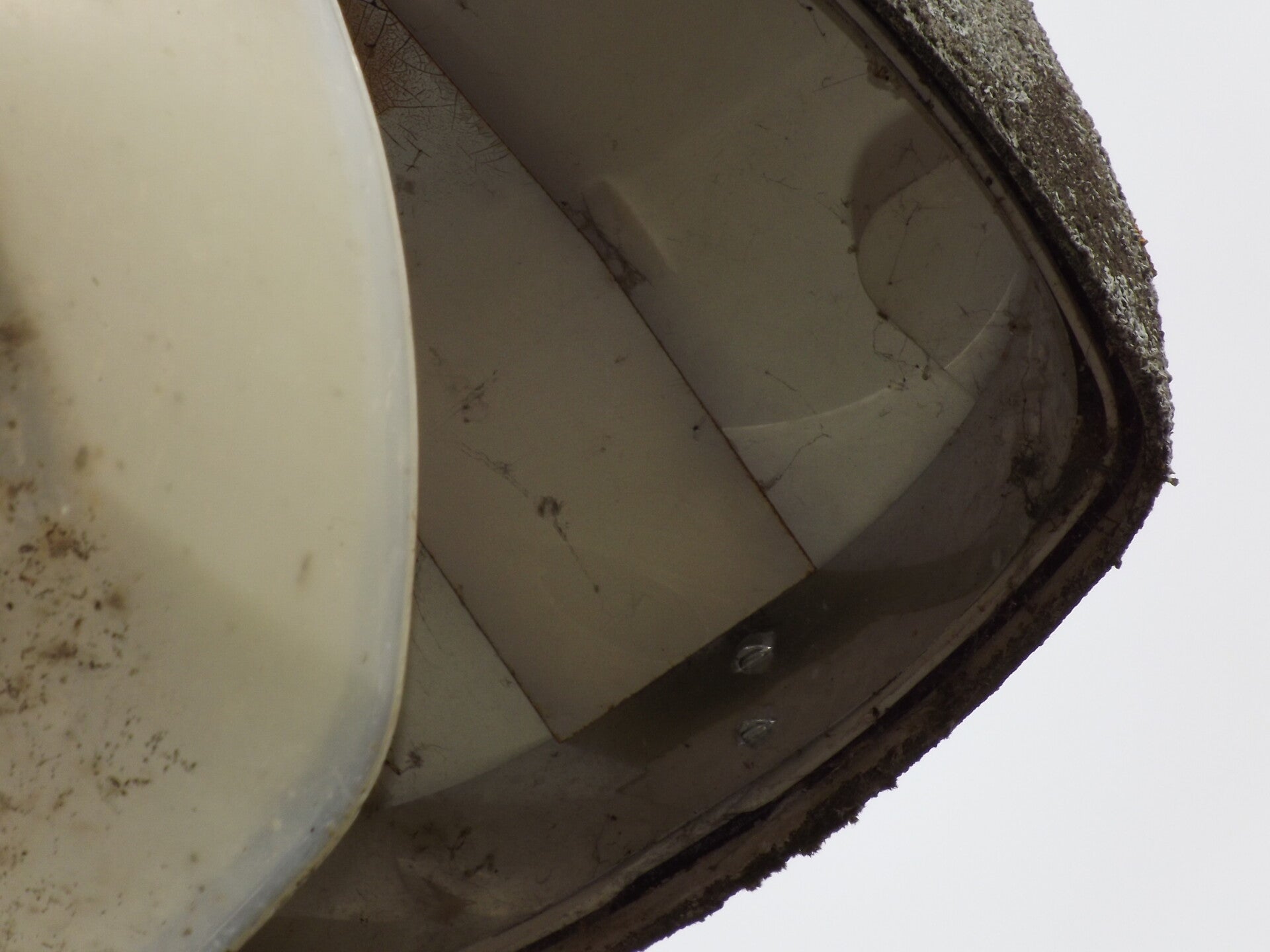 This does allow for an unobstructed view of the optic compartment in the CB-70. Two mirror-reflectors wrap around the front and sides of the compartment, as well as a reflector positioned above the lamp. This reflector is quite corroded nowadays, but it was entirely white to begin with.