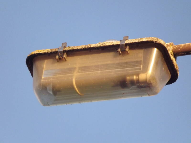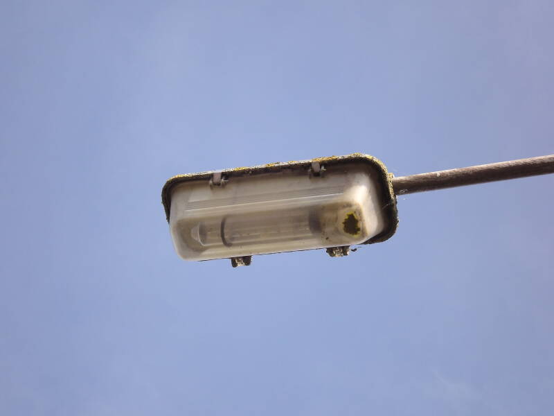 I continued down the road to column T5, with a bent bracket. It's not too apparent from this angle, but if you look closely, it's bent backwards away from the camera. A clip is also missing from the lantern and the column door is dented. This damage indicates that the column had a low-speed impact from a vehicle. I couldn't find the clip around anywhere, so I thought that the damage must have occurred long ago. After checking maps, my hypothesis was correct, with the column being struck pre-2009.