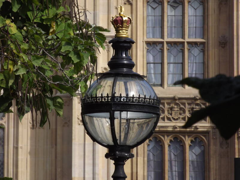 This type of globe lantern can be found online here, referred to as the 8-Panel Globe. Originally, they were installed on ironwork atop pillars, but they were stored away in WW2 when the ironwork was (presumably) melted down and used for the ongoing war effort. A subsequent refurb of the lanterns by SUGG saw them used from 1972-1974 onwards to light the road leading to an underground car park.
