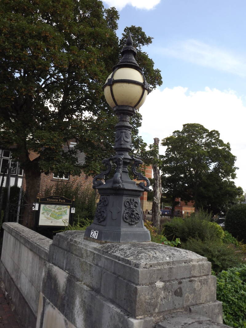 Four small SUGG Classic Globes are used on Victoria Road Bridge outside of Stafford Train Station. I don't know what lamps these run, but I'd guess high-pressure sodium. Column 25 is pictured below: