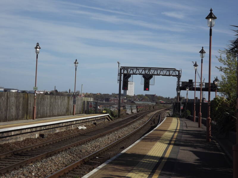Some ceiling-mounted ones are located under the canopies on the platforms. These confirm that the lamps would have been horizontal originally. Different LED lamps are employed for a more controlled light-distribution.
