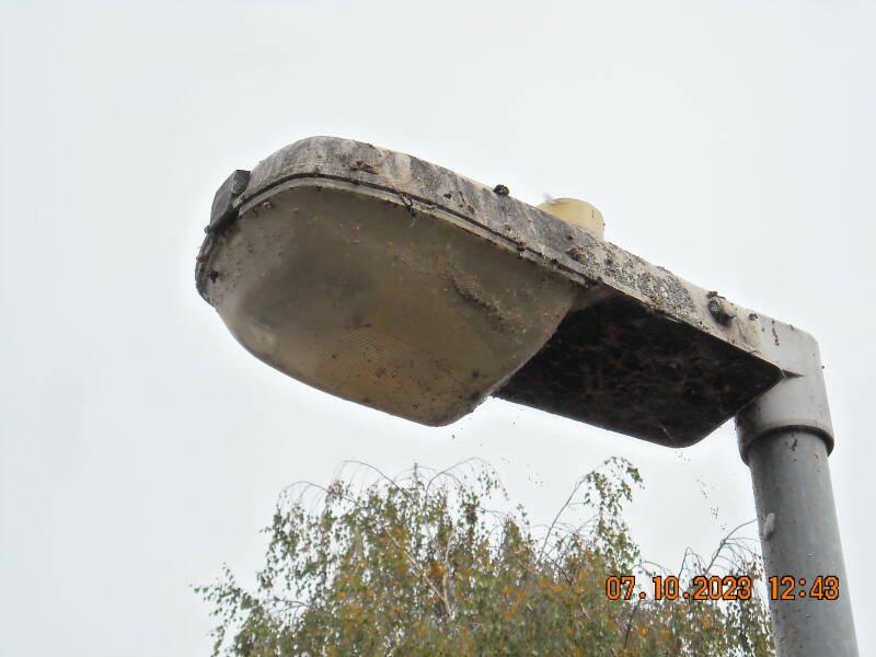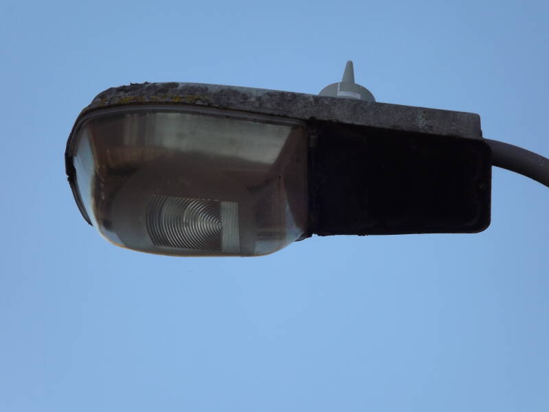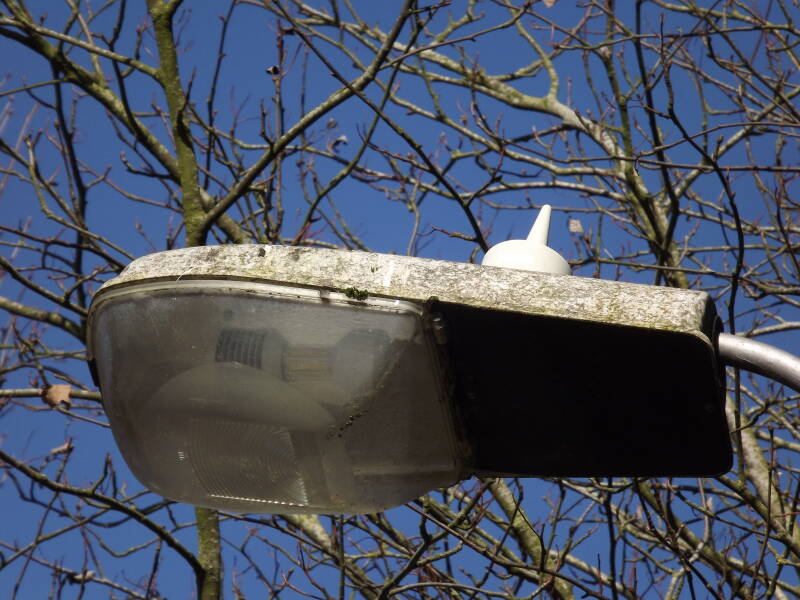 Thorn Beta 79s are commonly used here on private lots. This first example runs 50W SON-T and is mounted on a 3m column in a private car park. It has a Zodion SS2 photocell. As you can see, the 3m mounting height hasn't done it any favours for the lantern. It is covered in bird muck and cobwebs, and I'd imagine the gear is infested with spiders!