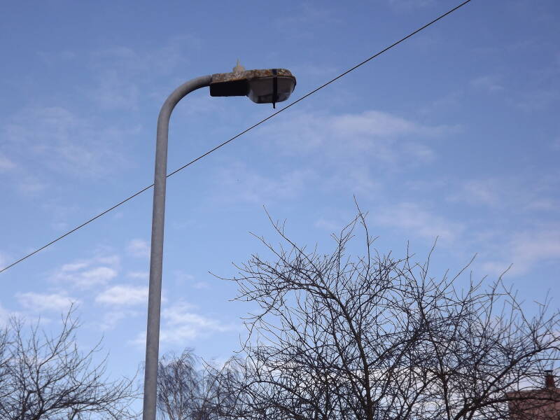 Just opposite the last installation on it's pole bracket, is this 5m hockey stick column supporting a THORN Beta 79 with a bowl held on by electrical tape.
