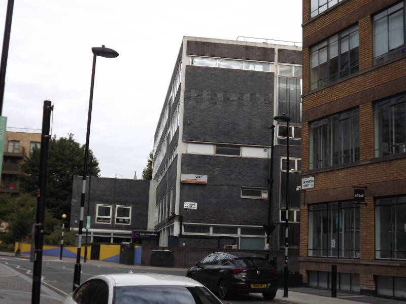 Some unusual Arc 80s are present on Drummond Street. This used to be a pedestrian crossing until recently. You can see the new location of the pedestrian crossing in the background; the two Arcs would have been used to light the old crossing, and the columns still have their zebra paint.