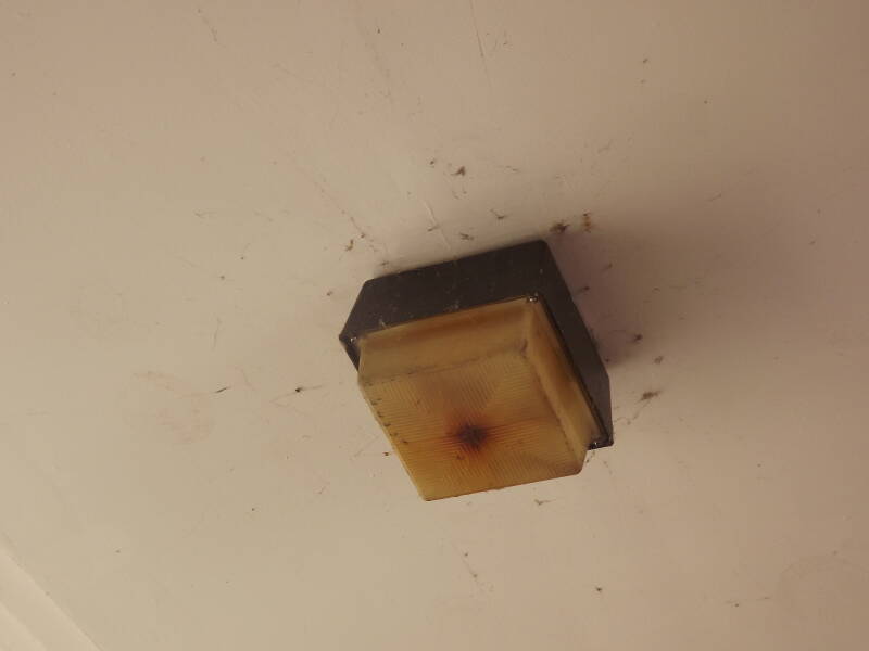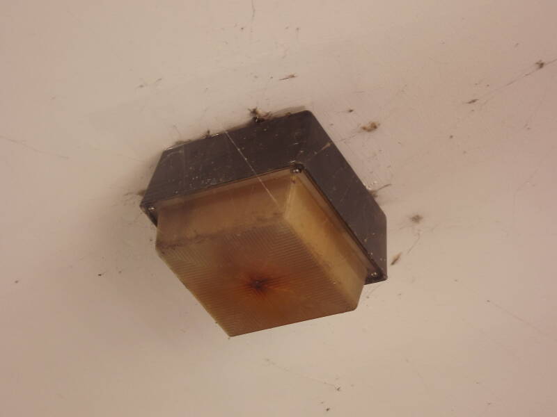 Judging by the scorched bowls, these have been in service for quite a while. The lamp-compartment is slightly too small on these fixtures, so they can get heat-stressed. I'd guess these run 100W or 70W SON. The closest lantern was pictured first: