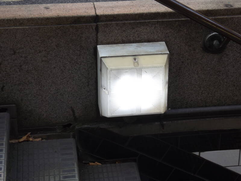 Town Hall Passage has a considerable number of bulkheads and floodlights. Among the variety are a series of DesignPlan Brunnel luminaires. These feature a shield to prevent upward-light-distribution. This first example is fitted with anti-bird spikes; these do not act as anti-spider spikes though!