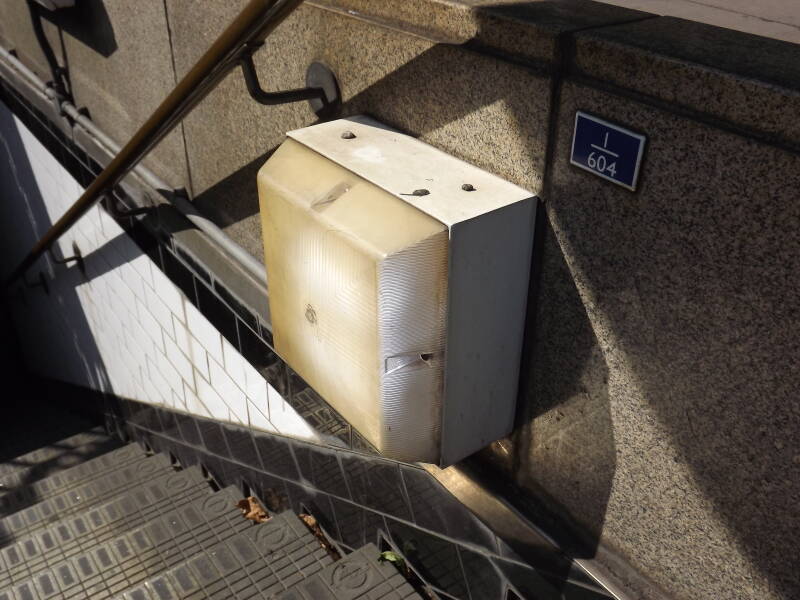 These DesignPlan Brunnel bulkheads are installed on the steps down to Chancery Lane Tube Station. They appear to have been LED retrofitted in recent years, but chances are they ran 2D fluorescent lamps originally.