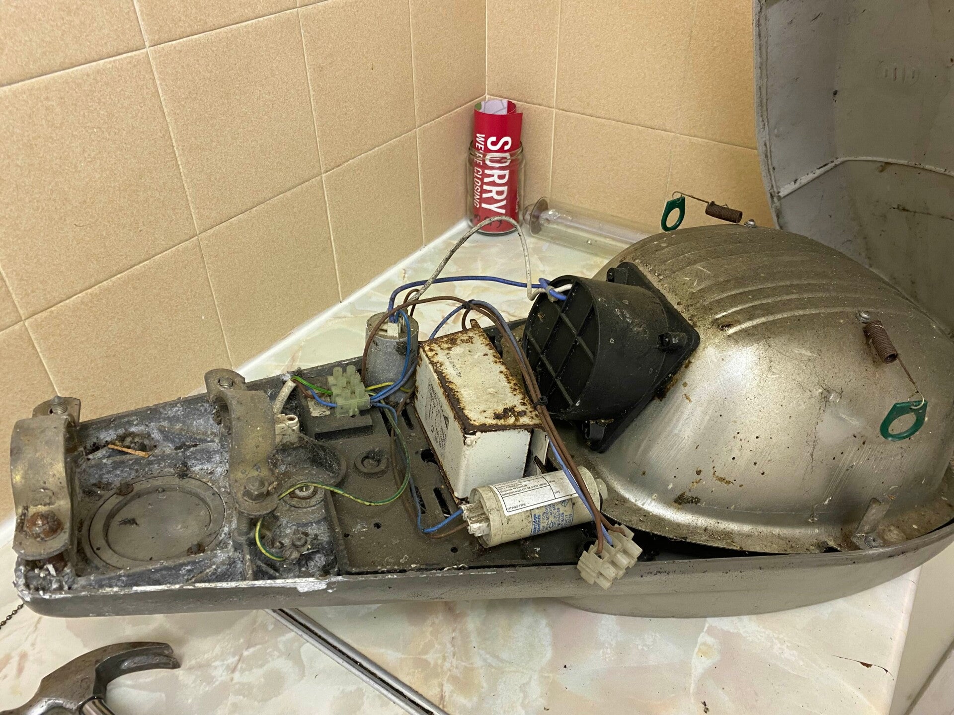 With thanks to Nick for this lantern. The AEC AEC 2 can trace its roots back to the Italian manufacturer AEC Illuminazione, but it was outsourced to countless countries. The exact quantity of countries that this specific design made it to is unknown, but AEC has a presence in 44 countries as of 2025. In the UK, it was sold by Kingfisher, but the fixture name it was sold as is not known, as the only reference to the Kingfisher brand on this example is an incomplete sticker on the capacitor - a rather unusual place for a fixture ID sticker to be located given all of the open space on the canopy and gear-tray.