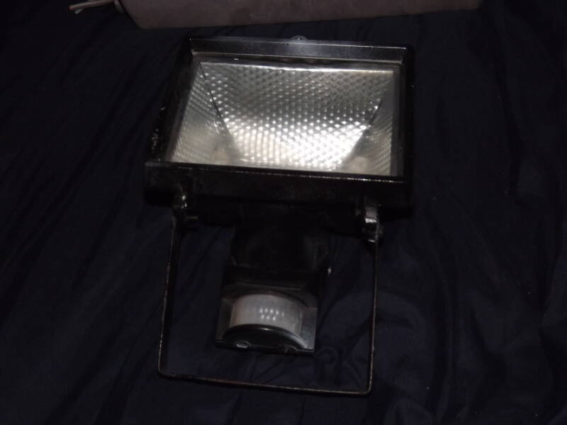 This flood was removed from a house near me. It looks to be quite badly rusted, and appears to have been painted at some point in the past in an effort to "repair" or cover up the rust. This however hasn't stopped the paint coming away at the top of the canopy. It does work and has a maximum of 500W. It is not known where it is purchased from, or how long it was in service. It looks to have been white originally before it was painted black.