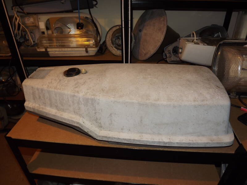 This enormous lantern was removed in 2010 from the London area (possibly the M25 but that is just speculation). It came with a 400W lamp and gear, but was originally a 250W lantern. Whether it was changed to a 400W lantern during it's service or after it's removal remains unclear. Being 400W it is my most powerful high-pressure sodium lantern.