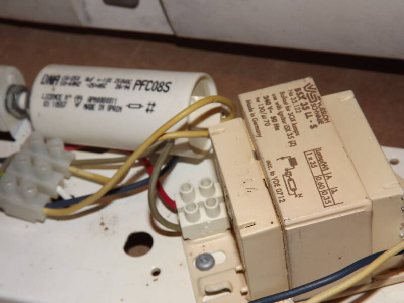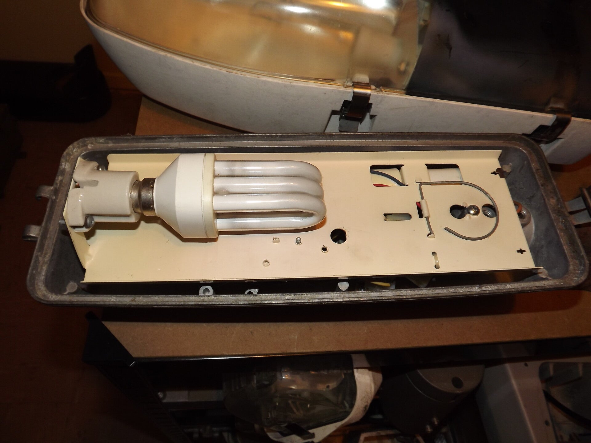 It was fitted with a domestic CFL lamp - I presume after the ignitor failed (and whoever owned it saw the price of SOX lamps nowadays!) an attempt to relight it was made by fitting a CFL lamp. This wouldn't have worked on the SOX gear which was still connected, and so the lantern was removed entirely.