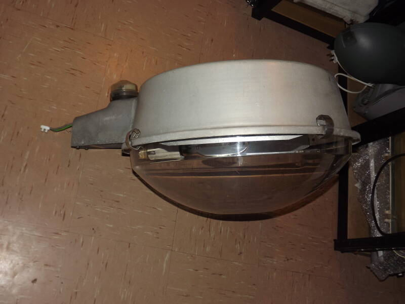 With thanks to MidlandCountiesStreetLighting for this lantern. This one was removed from Stafford Street in Wolverhampton in 2006. Before the Simplex Jupiters, in this area existed REVO Helion lanterns. This is the remote-geared version of the lantern for 250W-400W SON. I've placed a 250W clear SON-E lamp inside for these photos. I've given these lanterns the nickname "Saucepans" (especially the Jupiter Major) - and I'm sure I'm not the first to have thought of this, given their similitude to them.
