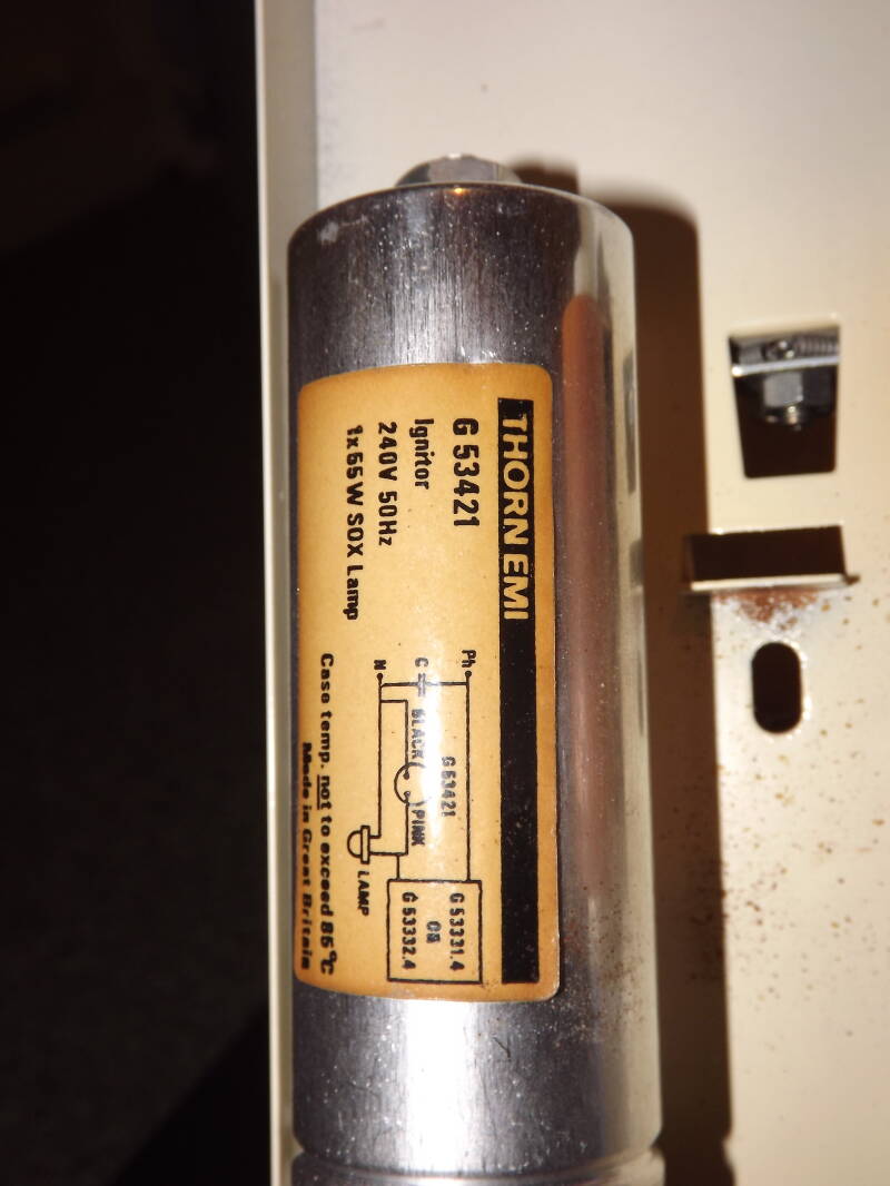 The inside of the lantern was actually clean from debris and bugs too, just a little dirt here-and-there, but nothing a damp cloth wouldn't get rid of! So let's take a look at the gear! The ballast is a Thorn G53332.4, but more unusual is the Thorn EMI labelled, G53421 ignitor. That EMI label means it was manufactured between 1984 and 1987. It may have been implemented into the lantern as a past repair, or may have been placed in from a stockpile of them when the lantern was originally put together.