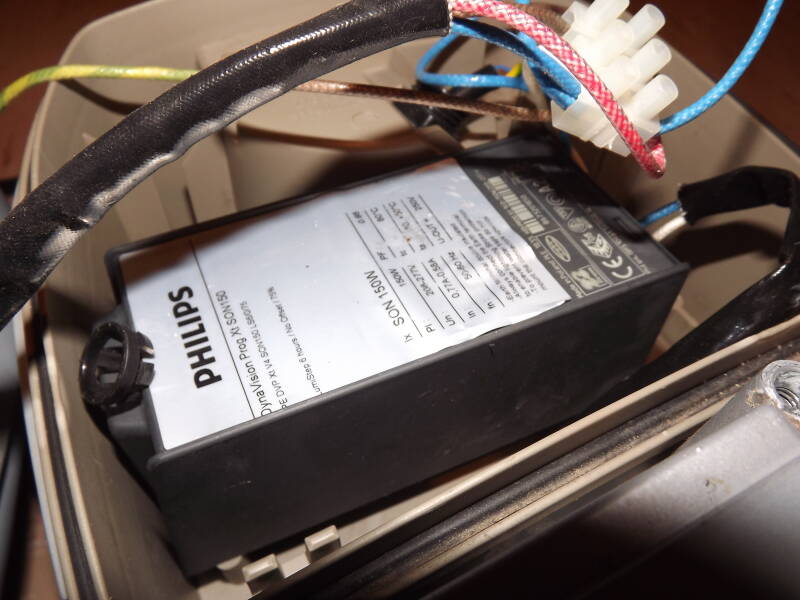 A view of the Philips DynaVision Prog Xt SON150 driver in the gear area. What I found unusual is that this was free floating in the lantern, not secured down at all as there was no where to put the screws in. This may have been installed as a repair at some point.