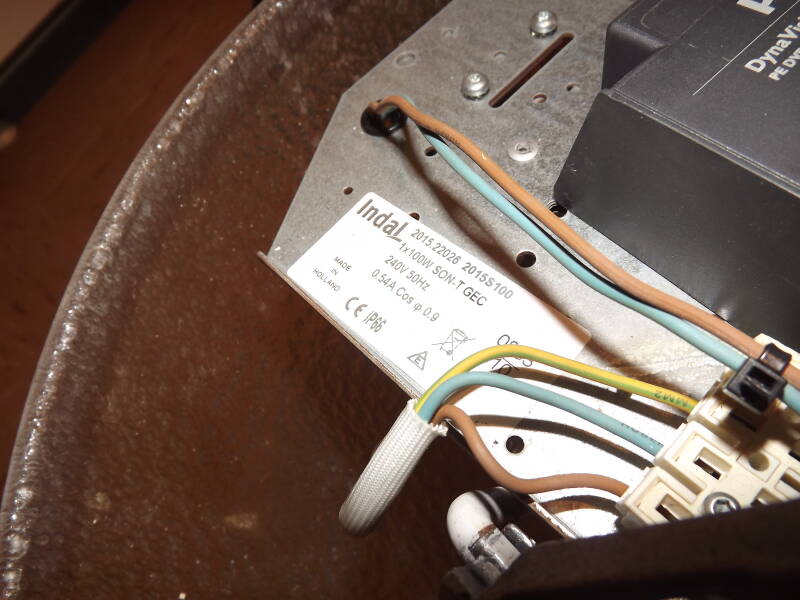 When this example was purchased, it was missing a photocell, ignitor and capacitor. I installed a new cell and a Philips DynaVision Programmable Xt SON100 ballast
