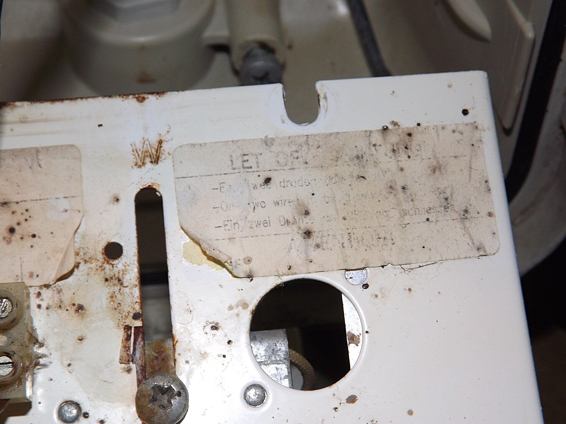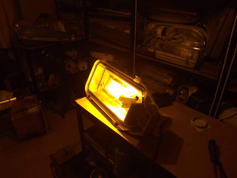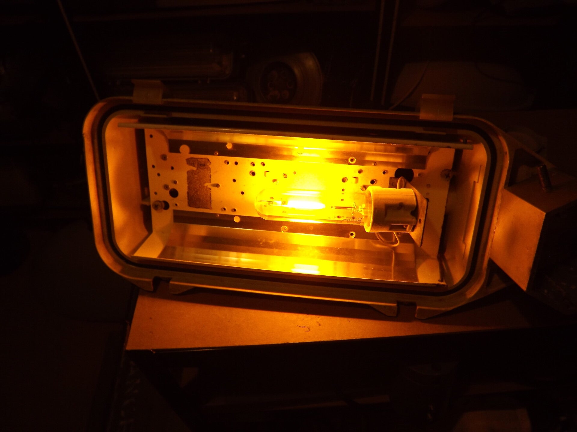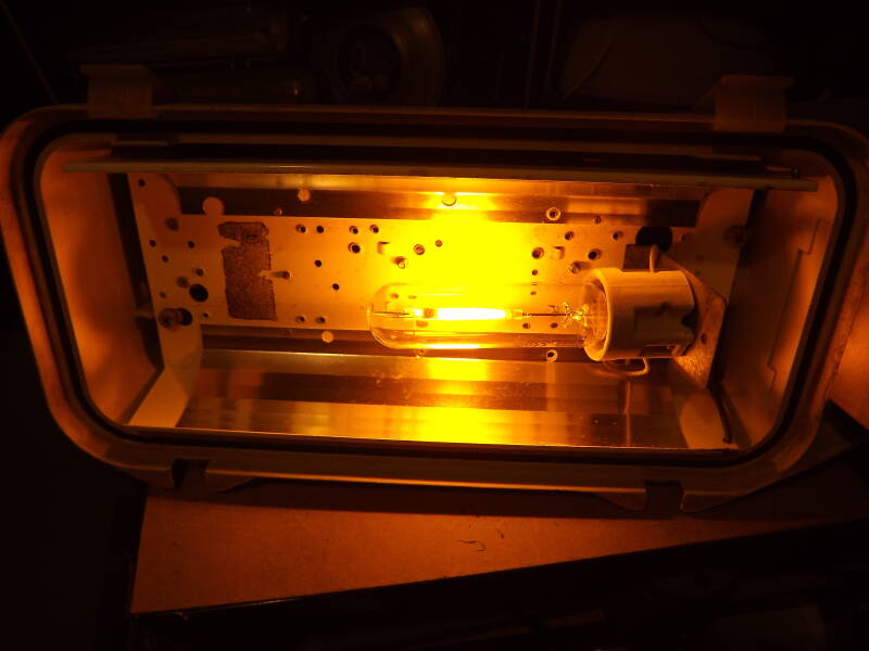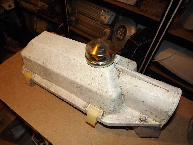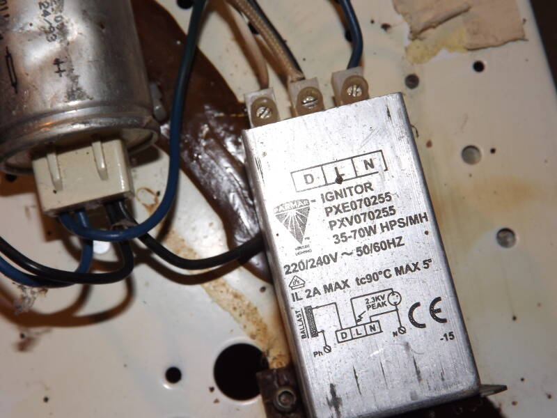 The lamp it came with is intact, but its predecessor certainly wasn't! Notice specks of rust beginning to compromise the gear-tray, it having been exposed directly to the elements for years.