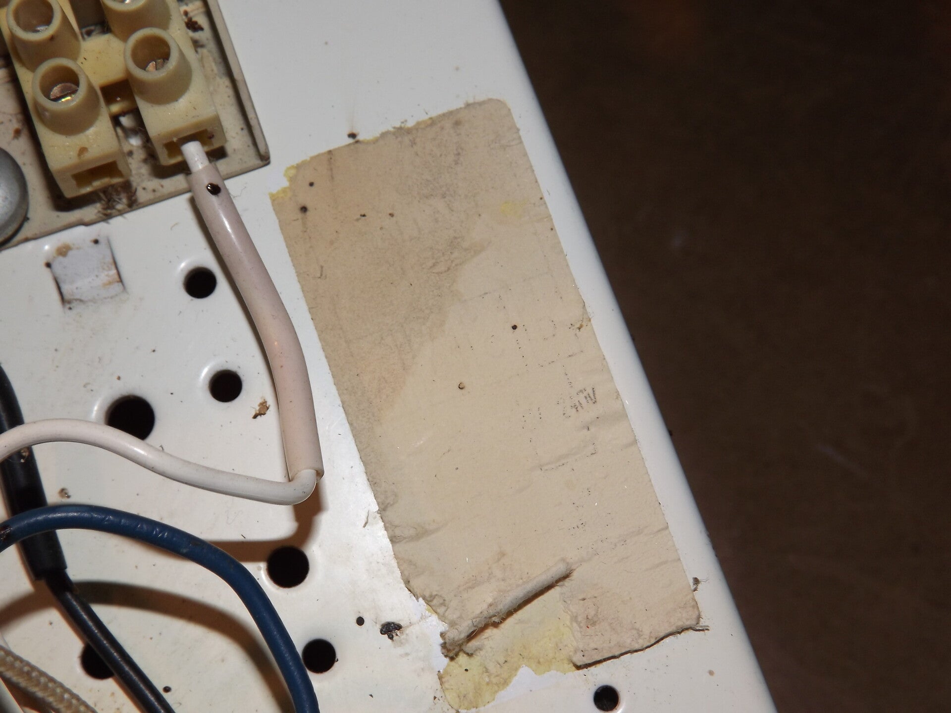 The ignitor is a replacement, as the other one seems to have exploded or caught fire. Notice the hardened goop on the tray from the last one!