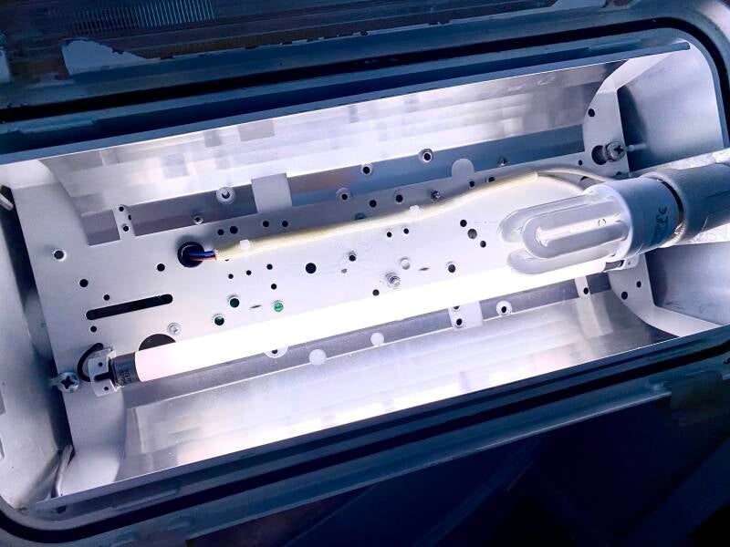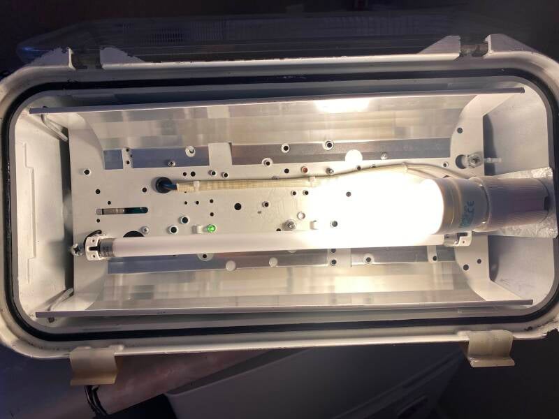 The primary lamp does not need a gear, and an emergency circuit board and twin-cell NiCd battery is installed for the T5 tube to use.