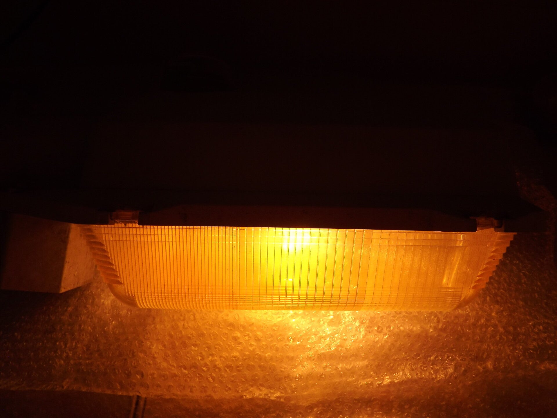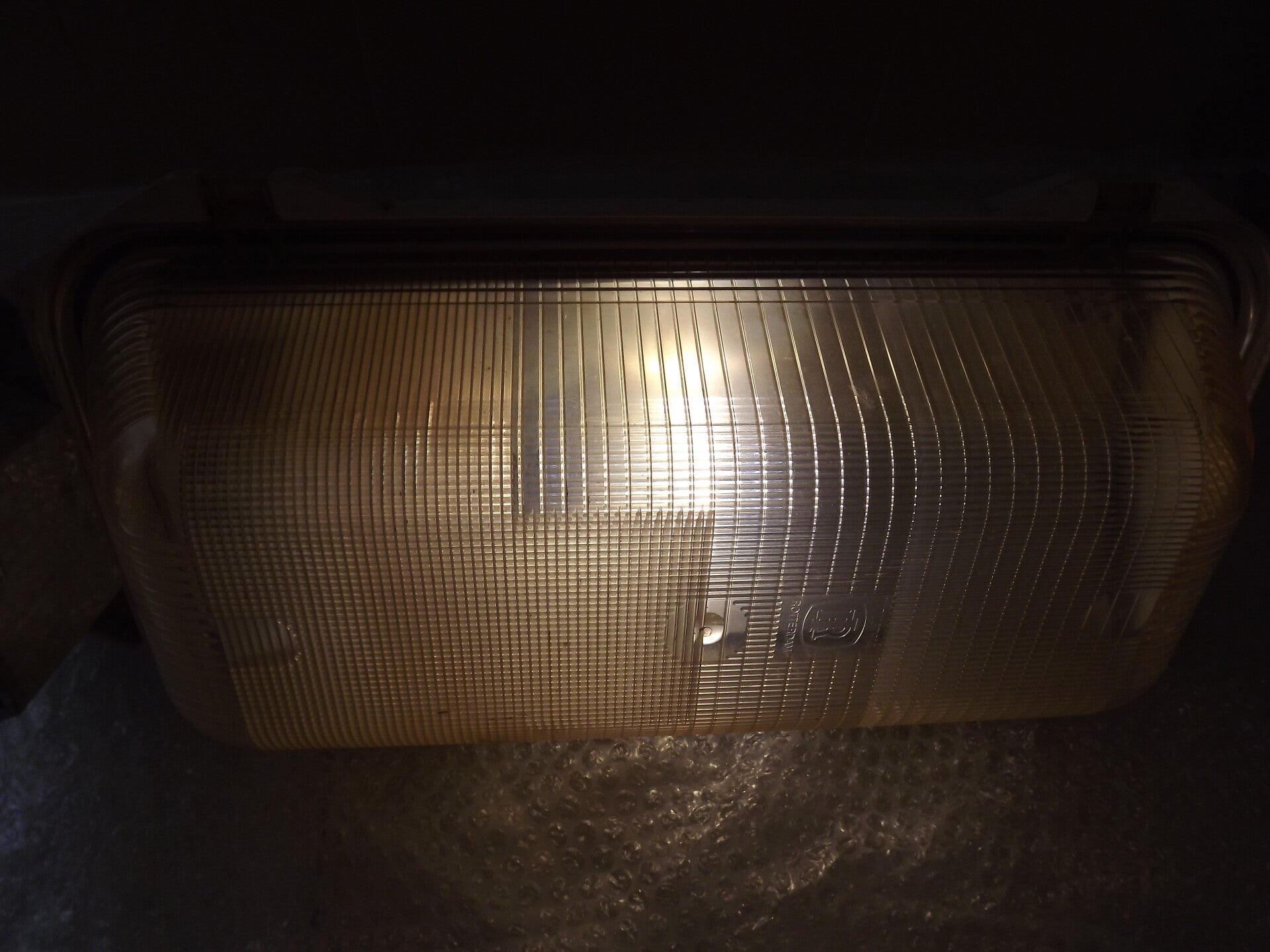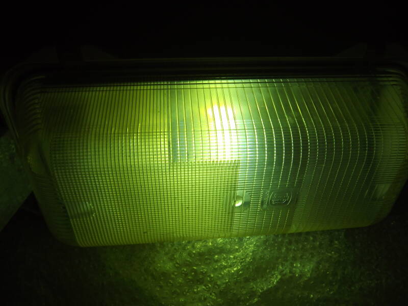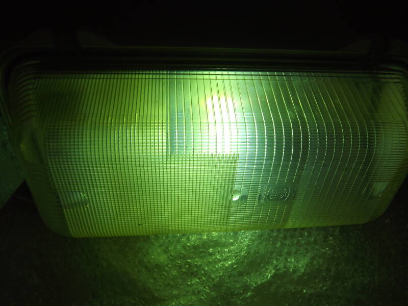 WRTL's 2600 was a wildly popular lantern throughout Europe, having been able to run a plethora of lamp-types. This is the 7th WRTL 2600 currently in the collection. Unusually, this lantern runs 60W CPO-TW on a retrofit gear-tray, but probably ran SON originally. Because of the lamp-type, the bowl is weakened and yellowed. Notice on one side the lantern is missing a clip.
