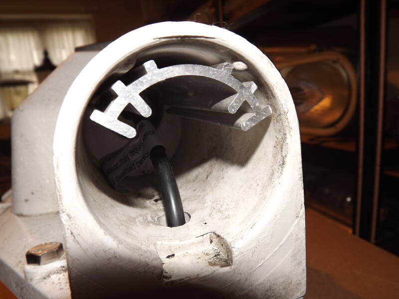 Undoing the single clip releases the brittle bowl. The first thing that is evident is the unusual reflective gear-tray, not original to the lantern. The identification-sticker was on the previous gear-tray, so this lantern doesn't have one.