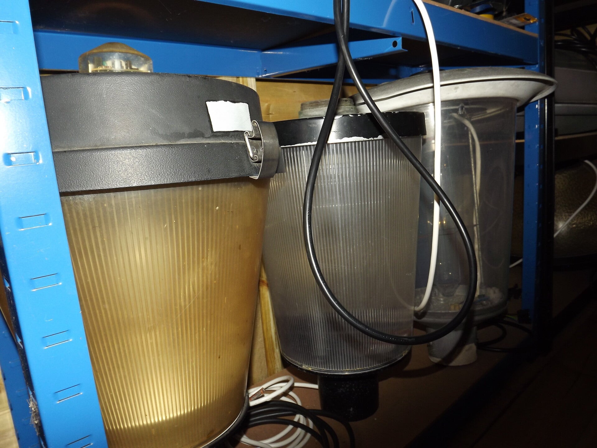 Three post-tops were observed on one of the shelves within the shed: A Siemens 70W SON PTBTS70N, a remote-geared GLS Thorn Gamma 6, and a 35W SOX Phosco P107.